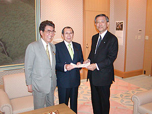 | Photo: President Sasamori (right) hands a written petition to House of Representatives Speaker Watanuki (center). House of Representatives Vice-Speaker Watanabe is next to Watanuki. (At the House of Representatives Speaker's official residence) |