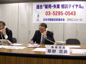 Amidst the seemingly bottomless worsening of the unemployment rate and recognizing we are in the middle of a critical job situation RENGO headquarters and local RENGO have again established the RENGO "Employment Consultation Hotline" on February 12 converting their regular "hotlines" as they did last October. Approximately a hundred serious consultations were received at RENGO headquarters (as of 3 p.m., Feb. 15) between February 12th to the 15th. At 9 a.m. on February 12, the phones began to ring at RENGO headquarters. Serious consultations regarding dismissal, unpaid wages, age limit at re-employment and so on came in one after another. General Secretary Kusano also sat in to respond