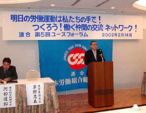 RENGO held its 5th Youth Forum at Ikenohata Bunka Center in Tokyo on February 14, with the slogan "Guide Tomorrow's Labor Movement with Our Hands! Create Exchange and Networking Among Fellow Workers!" Approximately 140 young members involved in youth activities at affiliated organizations and local RENGO gathered at the forum. They got to know each other better by discussing how youth activities ought to be. Representing the organizers General Secretary Kusano gave a speech reporting on RENGO activities regarding Koizumi's structural reform, medical system reform, the 2002 Spring Struggle, and work sharing. He also expressed his expectations to