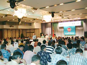 During the discussion on the Spring Struggle/Interim Summary, some of the ideas presented included the following: the results of the major unions wage battles were largely reflected in the small to mid sized unionsand that result was only negative. We want to have concrete demand standards at next years Spring Struggle. Interest in the problems regarding part-time work is high, but the issue remains log jammed. We want this matter treated more seriously. A radical response for issues on minimum wage should be taken. Also, an opinion was presented regarding the securing of personnel resources at local RENGO. Based on these discussions, RENGO will continue discussions at related committees such as the extended tactics committee. Regarding the other proceedings, FY 2002-2003 RENGO Demands for Policies with Priority, Changing of Officers, Award Ceremony, Meeting Schedules FY 2003 and others were endorsed. Furthermore, two other resolutions were adopted. Namely, the Special Resolution Demanding Interruption of the Legislative Agenda to Revise the Health Insurance Law and the Demand to Stop Establishment of Three Emergency Defense Related Bills, and the Resolution to Actualize Equal Treatment for Part-time Workers and Promotion of Organization. Holding this meeting in Okinawa was the realization of an answer to Governor Inamines request at the Action Route 47 meeting. Governor Inamine expressed his gratitude to the participants attending from all parts of the nation and RENGO Okinawa President Karimata offered an awesome performance of traditional Okinawan three-string guitar (Ryukyu Shamisen) as an expression of welcome. |