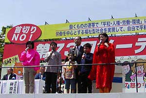 Regarding the work sharing issue, HLW Minister Sakaguchi displayed his desire to want to solve problems with a mid to long term perspective, centering on how we can improve the Japanese labor environments tendency toward overtime. Democratic Party of Japan President Hatoyama, Social Democratic Party Leader Doi, Liberal Party Secretary General Fujii were present at the RENGO May Day Central Rally and each gave a speech. President Hatoyama stated that it was an anguished year for the people. We will aim to achieve change of administration within the year. Party Leader Doi said that, Anyone can stand up for the strong. But it is the weak and troubled who must be given protection. Secretary General Fujii mentioned the fact that the unemployment rate is at a postwar record high is proof that the government has been making the worst economic policies since the end of the war. Each criticized the Koizumi administration one after the other and disclosed their collective determination for a change of government. Following that, Amnesty International Japan Vice Executive Director Ishihara, Japan International Volunteer Center Ogino, and a special guestFederation of Trade Unions-Burma President Lla Oo, each gave a speech. Afterwards, the rally adopted the Special Resolution to Break through Employment Crisis and the May Day Declaration and closed with a solidarity shout of Lets do it! which was led by President Sasamori. Meanwhile, at the Get-In-Touch Festival, there were exhibitions by NPOs, NGOs, and other sponsors, a Kids Park where children could pet animals, food booths, a May Day Music Festival, a flea market, an Open Air Fun Bazaar, and much more. This year there were 100,000 participants at the Central Rally and many families joined in the event held at Yoyogi Park where the festivities lasted well into the early evening.