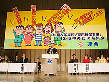 RENGO President Sasamori gave a speech before 3,500 participants at the central pep rally saying “the government is going to decrease pension benefits and dispose of a proposed increase of state liability in basic pensions to one half. We can no longer bear being forced to pay the price of misgovernment.”