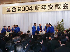 On January 5th, RENGO held its 2004 New Year banquet at a hotel in Tokyo. In a speech RENGO President Sasamori showed determination by saying, “to make this a year of recovery, RENGO will combine its power with government, labor and management to create a Japan where people can live happily and securely and bring about the recovery and rejuvenation of the RENGO labor movement.” Approximately 1,000 attendees were present including: Health, Labour and Welfare Minister Sakaguchi, Nippon Keidanren (Japan Business Federation) Vice Chairman Nishimuro, Democratic Party of Japan President Kan, Social Democratic Party leader Fukushima, Liberal Democratic Party General Council Chairman Horiuchi, New Komeito Party Chief Representative Kanzaki, and many other representatives from labor, politics, and the business world.