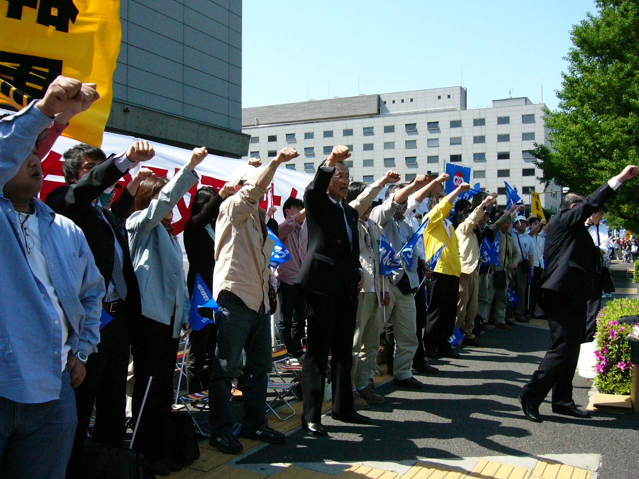 At noon, an "Angry Lunch Hour Rally" was held in front of the 2nd Office Building for House of Representatives Members. Speaking to the union members who were participating in a sit-in that filled the sidewalk as well as to other participants at the rallies in the Diet, RENGO President Sasamori was critical saying that "this Pension Act revision bill, which the government touts as its grand plan for the long-term future security of the nation is the worst bill ever; it will cut benefits, increase burdens, and even raise taxes." He then offered an appeal by saying "the ruling parties are prepared to railroad the bill through just before the extended holiday season in May. The Democratic Party of Japan and the Social Democratic Party have been desperately trying to block the bill but the situation now appears to be hopeless. Let RENGO comprehensively mobilize the will of the nation as a representative of the working people, rise up and stop any negative changes to the pension system and let us make a Japan where one can lead life with a smile."