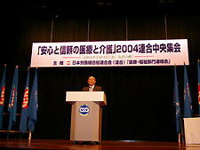 RENGO held its 2004 "Safe and Reliable Medical Care and Nursing Care" RENGO Central Rally at Kudan Kaikan hall in Tokyo on May 14 with 850 working people from the health/elderly care scene in attendance.