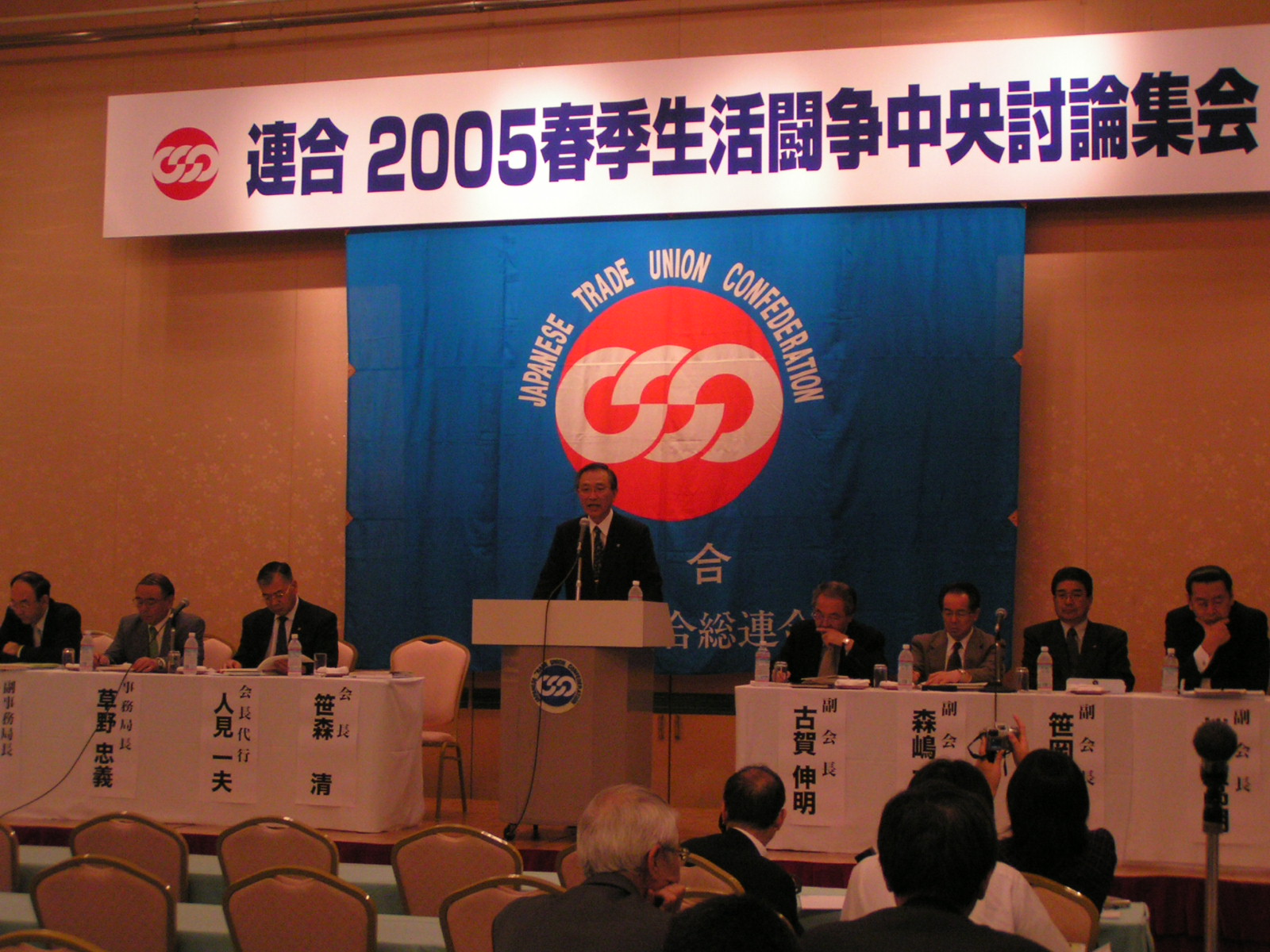 He described the present state of economic recovery has only now begun to show signs of bottoming out of the worst, but he indicated that this is not leading to overall economic recovery and emphasized that "I want all trade unions, by their collective will, to work on activities to maintain wage curves." Sasamori called on participants to demand and get across-the-board wage raises, if conditions permit, despite these being hard times.