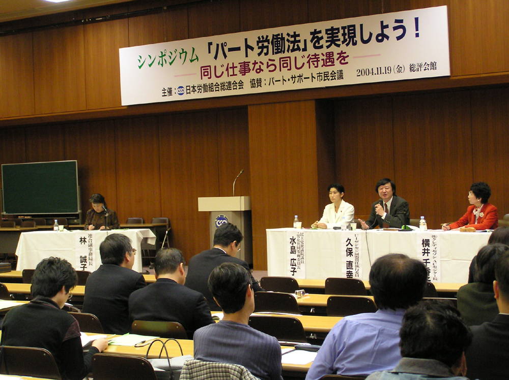 The symposium was co-sponsored by the Supporters for Part-Time Workers (whose official name is the Citizens' Conference for the Fair Treatment of Part-Time Workers). Representative Yamamoto of the organization addressed the symposium by saying "it is not only that part-time worker’s wages are low, but they are entirely without rights. The Labor Standards Law has not been upheld and part-time workers have been treated as a safety valve for Japanese economic conditions. People think that the issue of part-time workers is somebody else’s problem. It is important that we first create a law and then a reform movement to improve things. Let's make equality under the law a reality."
