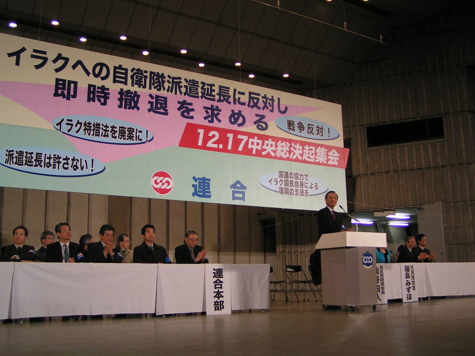In response to the unilateral decision by the cabinet to extend the term of dispatch of the Japanese Self Defense Forces in Iraq after the Diet had adjourned and without any explanation to our citizens, RENGO held its "12.17 Central Pep Rally to Oppose the Extension of SDF Dispatch in Iraq and Seek for its Immediate Withdrawal" at the Hibiya Amphitheatre in Tokyo with 3000 people in attendance. Policy Research Committee Chair Sengoku of the Democratic Party of Japan and Social Democratic Party leader Fukushima rushed to join the rally. Afterwards, participants marched from Ginza to the Tokyo Station area chanting "No War!" and "Extension is Unforgivable!"