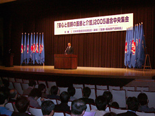 On May 14th, RENGO held its 2005 RENGO Central Rally entitled "Secure and Reliable Medical and Long-term Care" at the Hitotsubashi Hall in Tokyo. The rally was held in order to establish patient/user-oriented "Safe, Secure, and Reliable" medical and long-term care as well as to improve job/labor conditions for workers in the medical/long-term care fields. 820 participants from 30 affiliated organizations were in attendance at the rally. The "Medical/welfare liaison council" is the twelfth liaison council in RENGO and this is the second time the rally has been held since it was established.