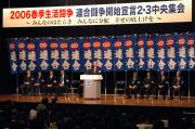 RENGO President Tsuyoshi Takagi opened the rally with the following call: “The critical points for labour to win through negotiations this spring are: the appropriation of funds for substantive improvements in wages, which we are demanding for the first time in five years; narrowing wage disparities at medium and small enterprises; and, improving hourly wages for part-time workers. Part-time workers and unorganized workers have placed great hopes on the 2006 Spring Struggle because it also takes up the social mission of correcting the gaps in contemporary Japanese society. Let us be aggressive in our negotiation talks in order to break out of the current impasse, where corporate performance is brisk but workers’ household budgets have deteriorated.” In response, representatives from the affiliates expressed their resolve for the 2006 Spring Struggle.