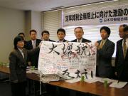 28 February at the peak of the deliberation of the House of Representatives on the fiscal 2006 budget and tax reforms, RENGO organized a meeting with Diet members of the Democratic Party of Japan (DPJ) in the Diet Members' Office Building. In the meeting, around 50 RENGO’s members from its affiliated industrial federations, as well as from RENGO’s Tokai region Council, encouraged and requested DPJ members of both Houses of Representatives and Councilors to make further efforts to reflect RENGO’s demands into the Diet deliberations, particularly in order to block the abolition of fixed-rate tax cuts. Assistant General Secretary Mr. Ohmi of RENGO introduced RENGO’s recent activities on the issue and asked for the DPJ to work ever harder within the Diet. The DPJ replied by stating their resolution.
