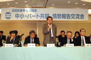 On 31 March, the eve of the revision of working conditions, the Joint Struggle Committees for Small and Medium Enterprises (SMEs) and for Part-time Workers jointly held a meeting to update and report on their efforts of the 2006 Spring Struggle. The meeting was attended by about 300 participants from RENGO’s affiliates and local RENGOs. RENGO President Mr. Takagi praised answers that had been coaxed from employers and cheered on upcoming negotiations: “Many of unions have succeeded in securing ‘fresh water’ or resources to virtually improve wages. Both Joint Struggle Committees have made all possible efforts and obtained excellent results. They have even created a stir in the society with widening gaps.”