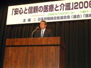 RENGO President Takagi opened the Rally, commenting on the Medical Reform bills: “We appreciate compulsory issuance of a detailed receipt describing medical expenses. However, there are many other crucial points to be solved, including the establishment of a new health care system for the aged”. “Workers engaged in the medical and welfare sectors are increasing rapidly, but most of them are not organized. We must get the unorganized to be organized”, he continued.