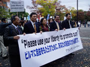 After the protest rally, all participants demonstrated in the street with banners saying “Freedom of Burma is the Freedom of World!” and “Please use your liberty to promote ours.”