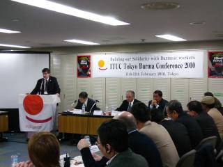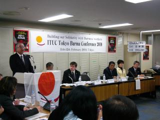 Toward Burma's 2010 general election scheduled for the upcoming fall, international concerns over the Burma issues are growing. On 11-12 February, ITUC held the ITUC Burma Conference 2010 in Tokyo at the RENGO Headquarters, hosted by RENGO. Over 80 participants from 21 countries attended the Conference, including Guy RYDER, General Secretary of ITUC, Noriyuki SUZUKI, General Secretary of ITUC-AP, Maung MAUNG, General Secretary of FTUB (Federation of Trade Unions - Burma), and other 34 trade union leaders. From RENGO, Nobuaki KOGA, President, Hiroyuki NAGUMO, General Secretary, and other officers participated in the Conference. Moreover, Chinami NISHIMURA, Parliamentary Secretary Vice-Minister for Foreign Affairs and Yoshinori SUEMATSU, Representative of the Japanese Diet Members' League for Support of Democratization in Myanmar delivered speeches.