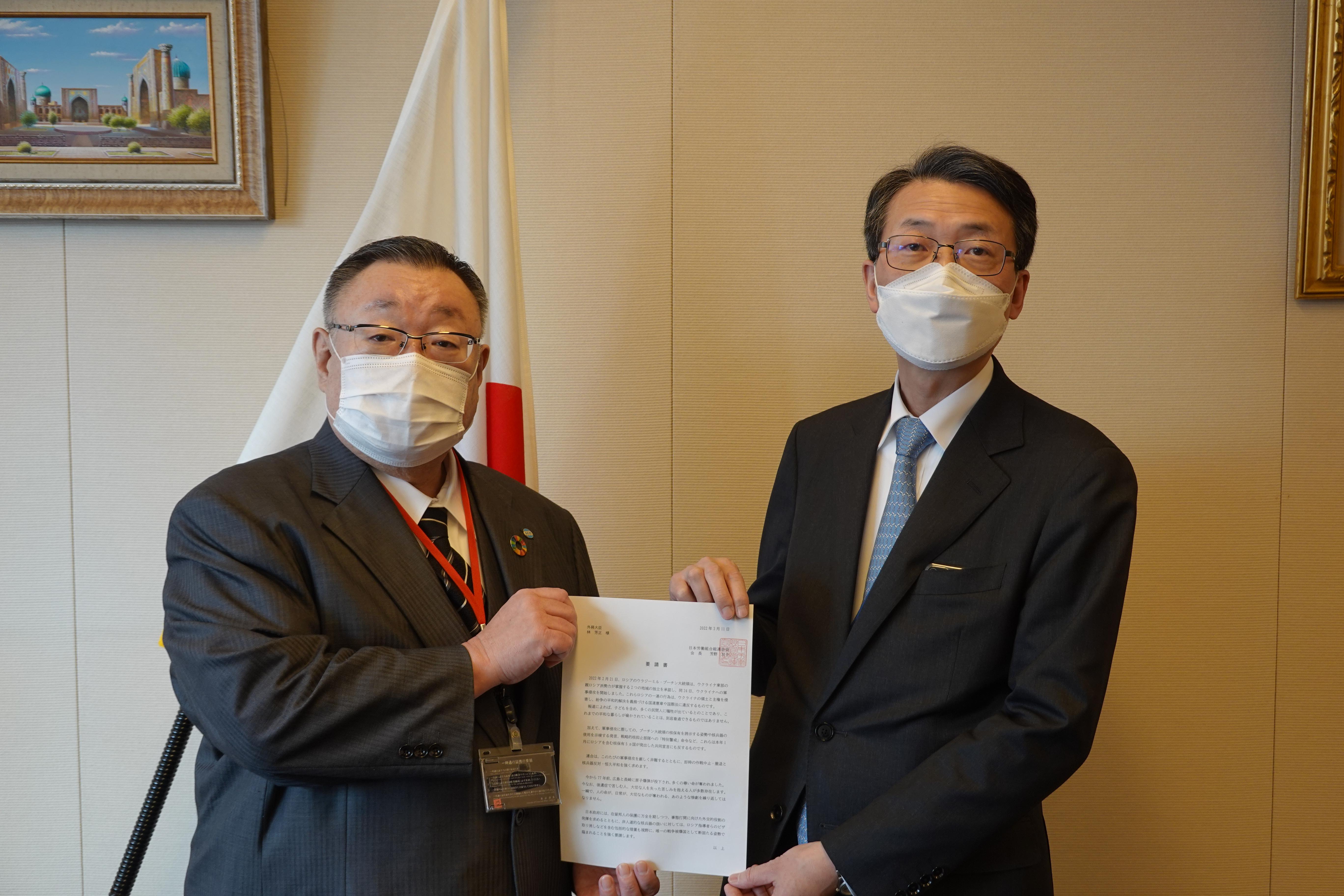 Handing over the written request to the MOFAJTUC-RENGO requested the Ministry of Foreign Affairs of Japan (MOFA) on 11 March 2022 regarding Russia's military aggression against Ukraine.